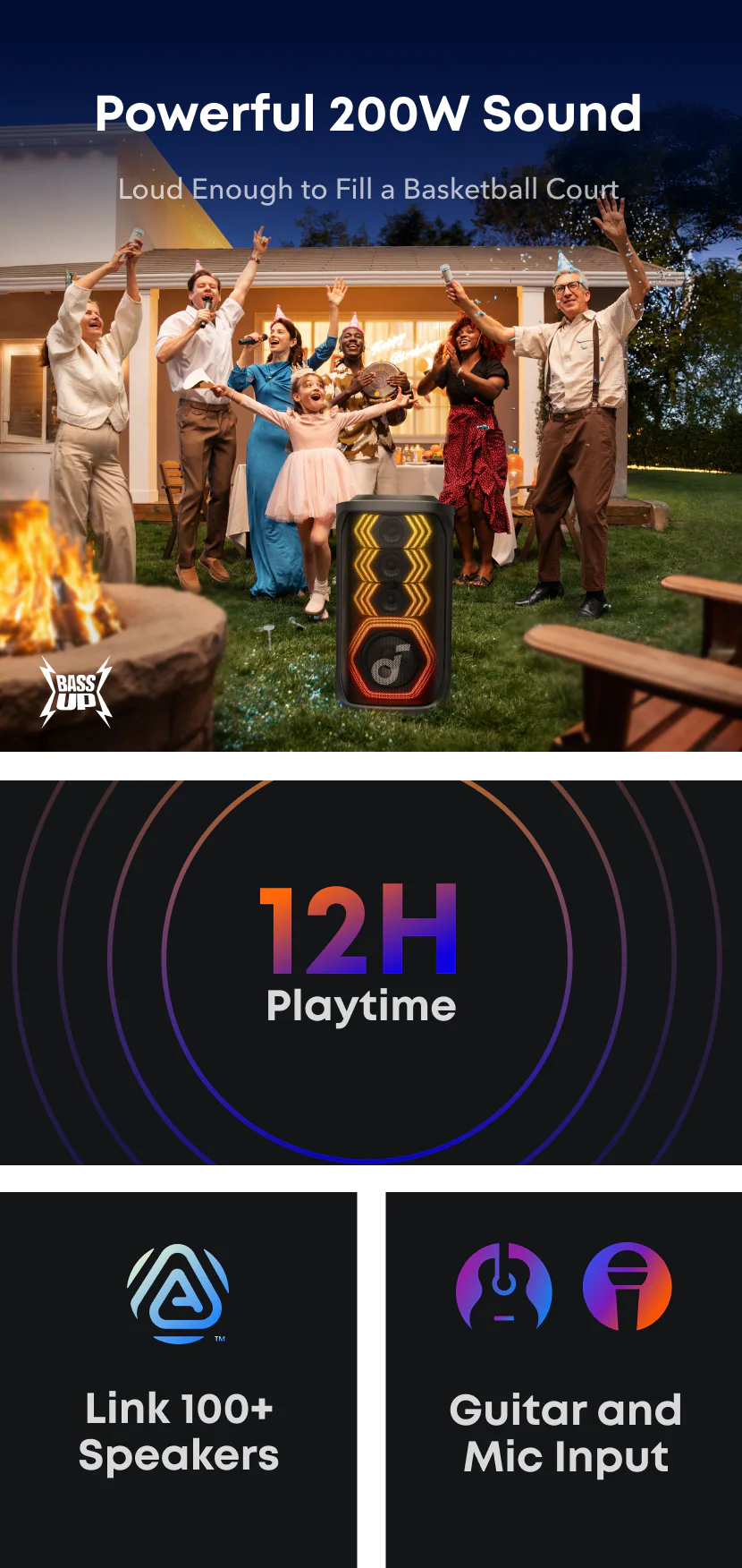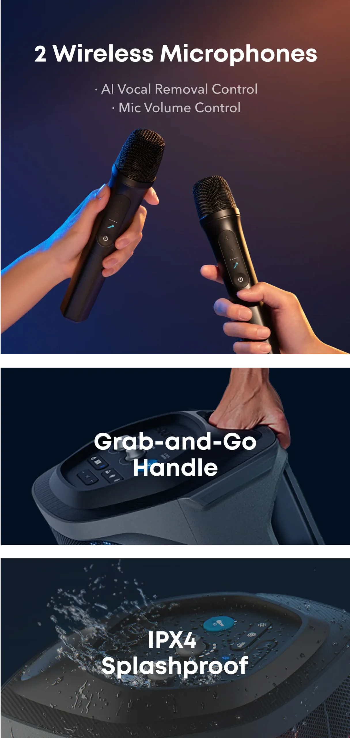 • Control EQ, lighting, mic effects, and reverb via the Soundcore app.