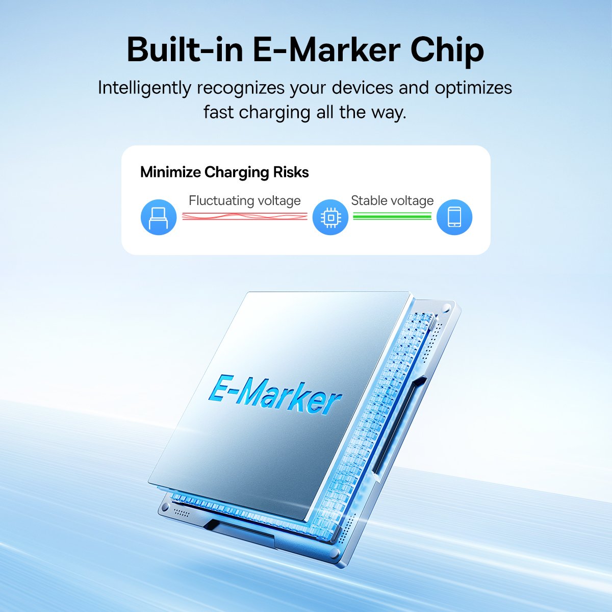 Smart E‑Marker Chip: Monitors and negotiates safe charging voltage/current; protects devices