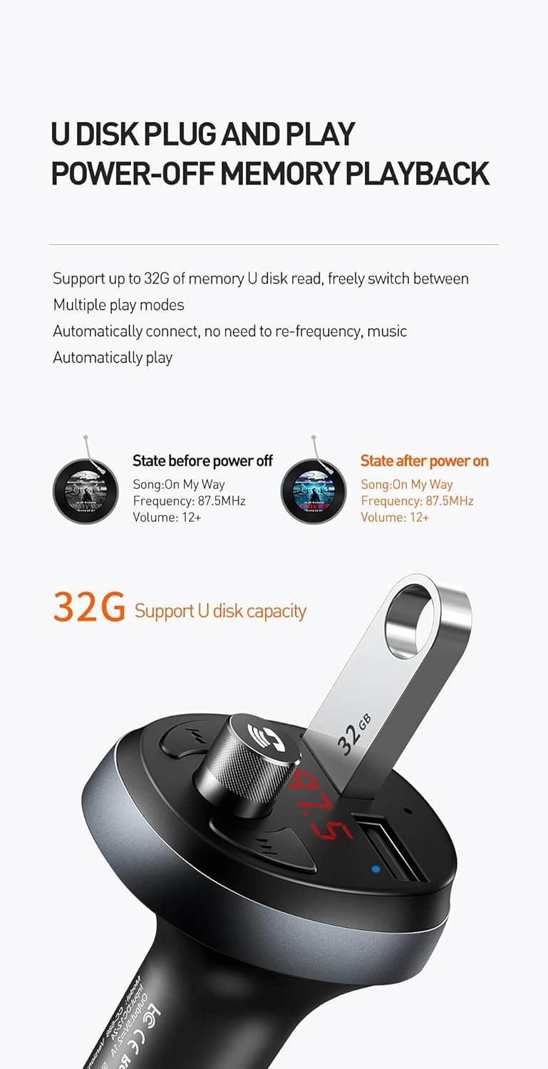 Bluetooth FM Transmitter – Stream audio wirelessly from your phone or U disk to your car stereo.