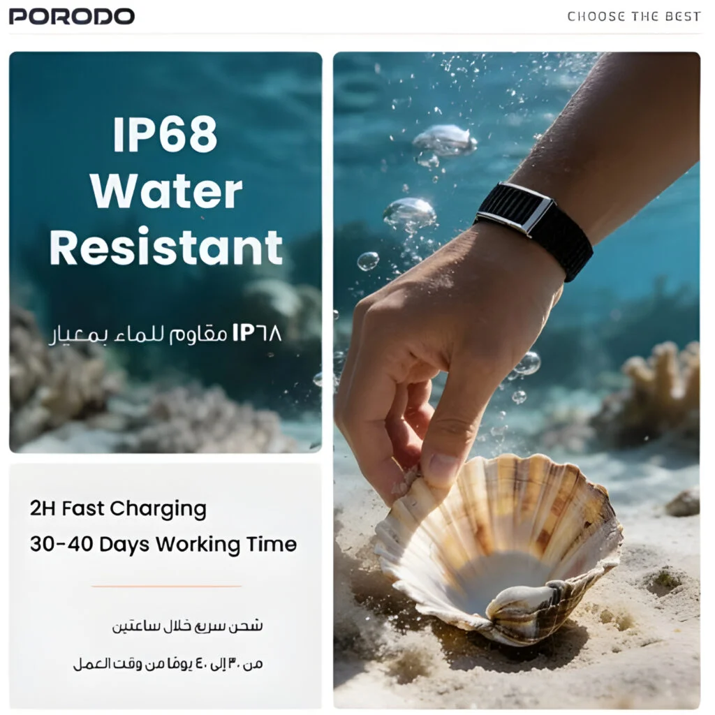 Stay on top of your fitness goals with the Porodo Trackfit Screenless Smart Fitband, designed for simplicity and performance. Built with durable zinc alloy and ABS materials, it offers a sleek and comfortable design for everyday wear. With up to 30 days of battery life, it ensures long-lasting performance without frequent charging. Track your activities with 120+ sports modes and monitor your health with advanced features like heart rate and sleep tracking. Its IP68 waterproof rating makes it perfect for workouts and outdoor use. A reliable and stylish companion for your fitness journey.