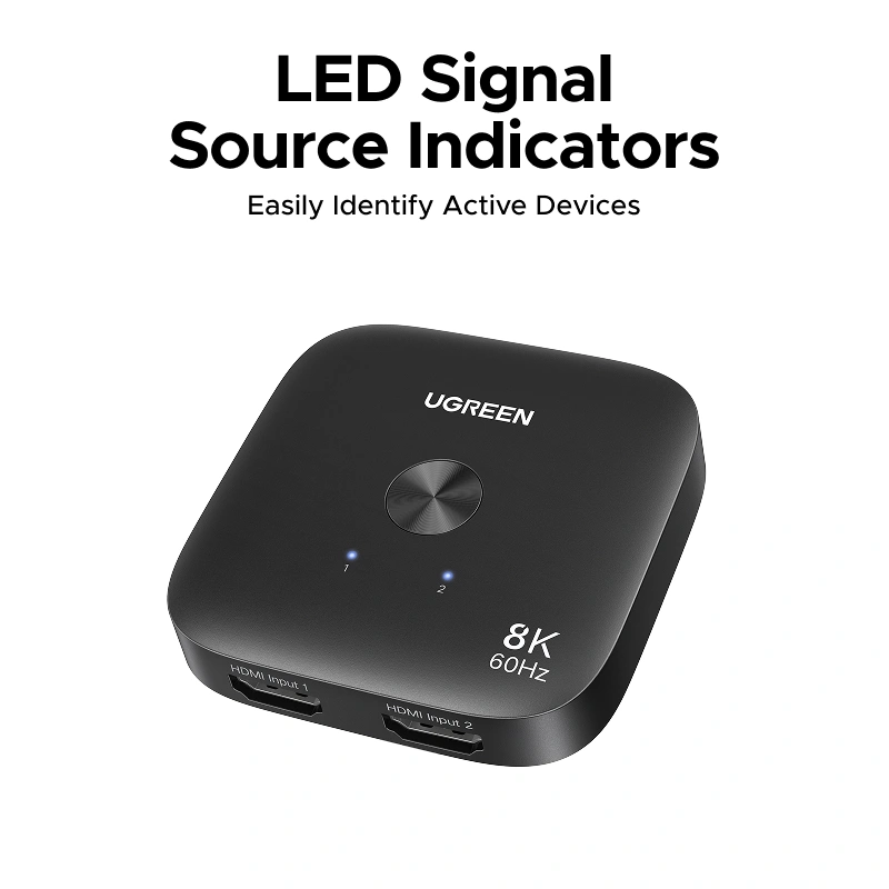 The UGREEN 2 In 1 Out 8K@60Hz HDMI Switch is a practical and reliable solution for managing multiple HDMI devices with ease. Designed for home entertainment systems, gaming setups, offices, and presentations, it allows you to connect two HDMI source devices to one display or conveniently switch HDMI signals without repeatedly plugging and unplugging cables. With support for ultra-high-definition resolutions up to 8K, it ensures exceptional video and audio quality with smooth, stable performance.