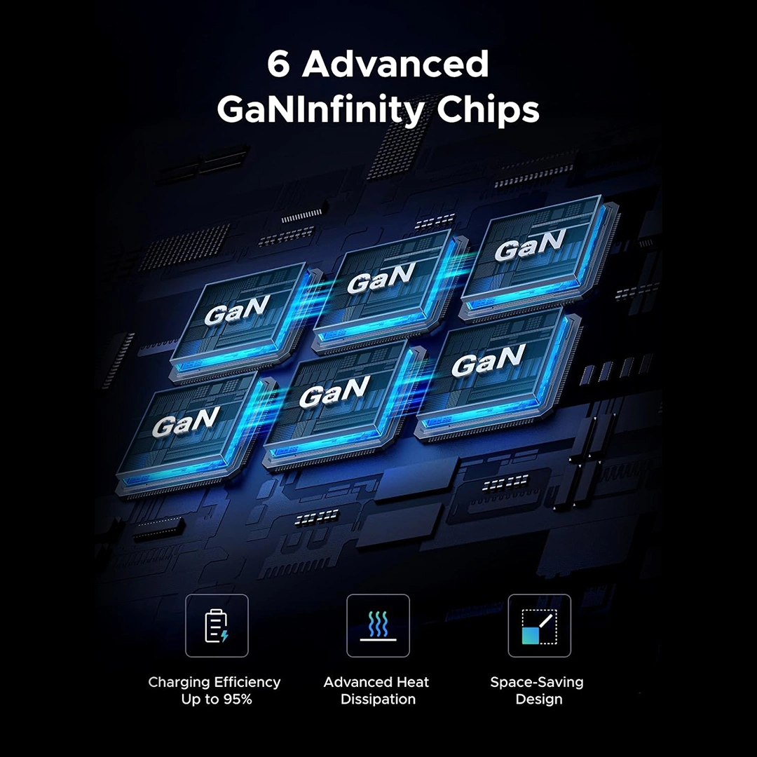 Delivers higher efficiency, reduced heat, and a more compact design than traditional silicon chargers. -