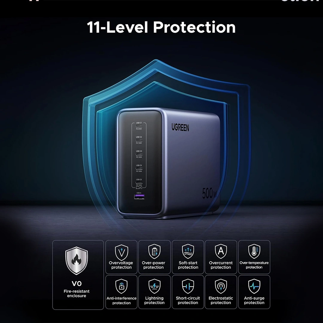 Powered by GaN Prime technology, UGREEN Nexode 500W Charger combines blazing-fast charging speeds, intelligent power management, and superior heat control — all within a sleek and compact desktop design.