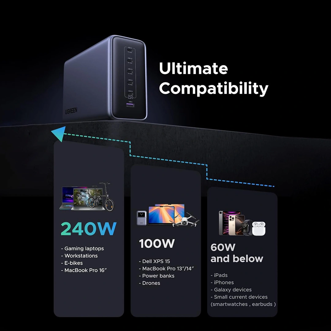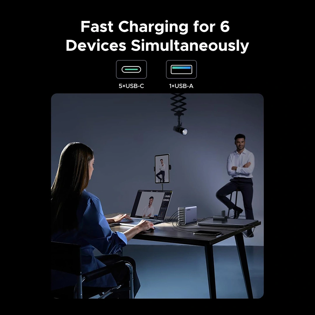 The UGREEN Nexode 500W GaN Desktop Fast Charger redefines power and performance with industry-leading charging capacity. Designed for power users, creators, and professionals, this high-end charger delivers up to 500W total output through 6 ports (5× USB-C + 1× USB-A) — making it perfect for simultaneously powering laptops, tablets, smartphones, and other gadgets with unmatched efficiency.