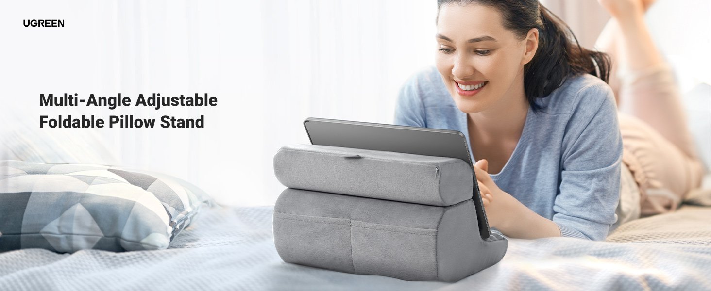 The UGREEN Pillow Tablet Stand is designed for comfortable, hands-free viewing wherever you are. Featuring a soft cushioned build, adjustable viewing angles, and wide device compatibility, it provides stable support on beds, sofas, desks, or even during travel. With practical storage pockets and a washable cover, this stand combines comfort, versatility, and everyday convenience.