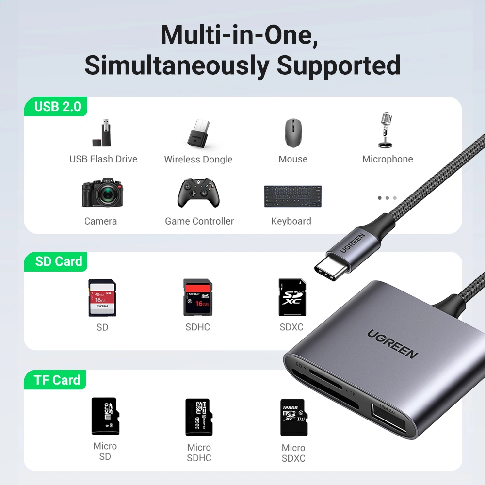Supports SD cards, microSD (TF) cards, and USB 2.0 peripherals, allowing you to access multiple storage formats using a single adapter. -