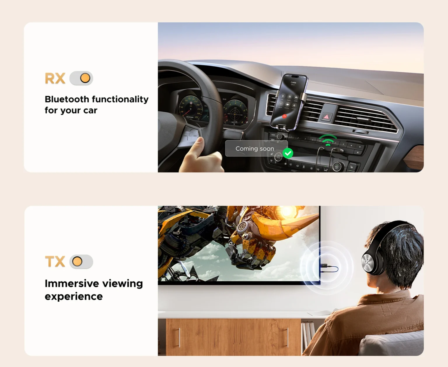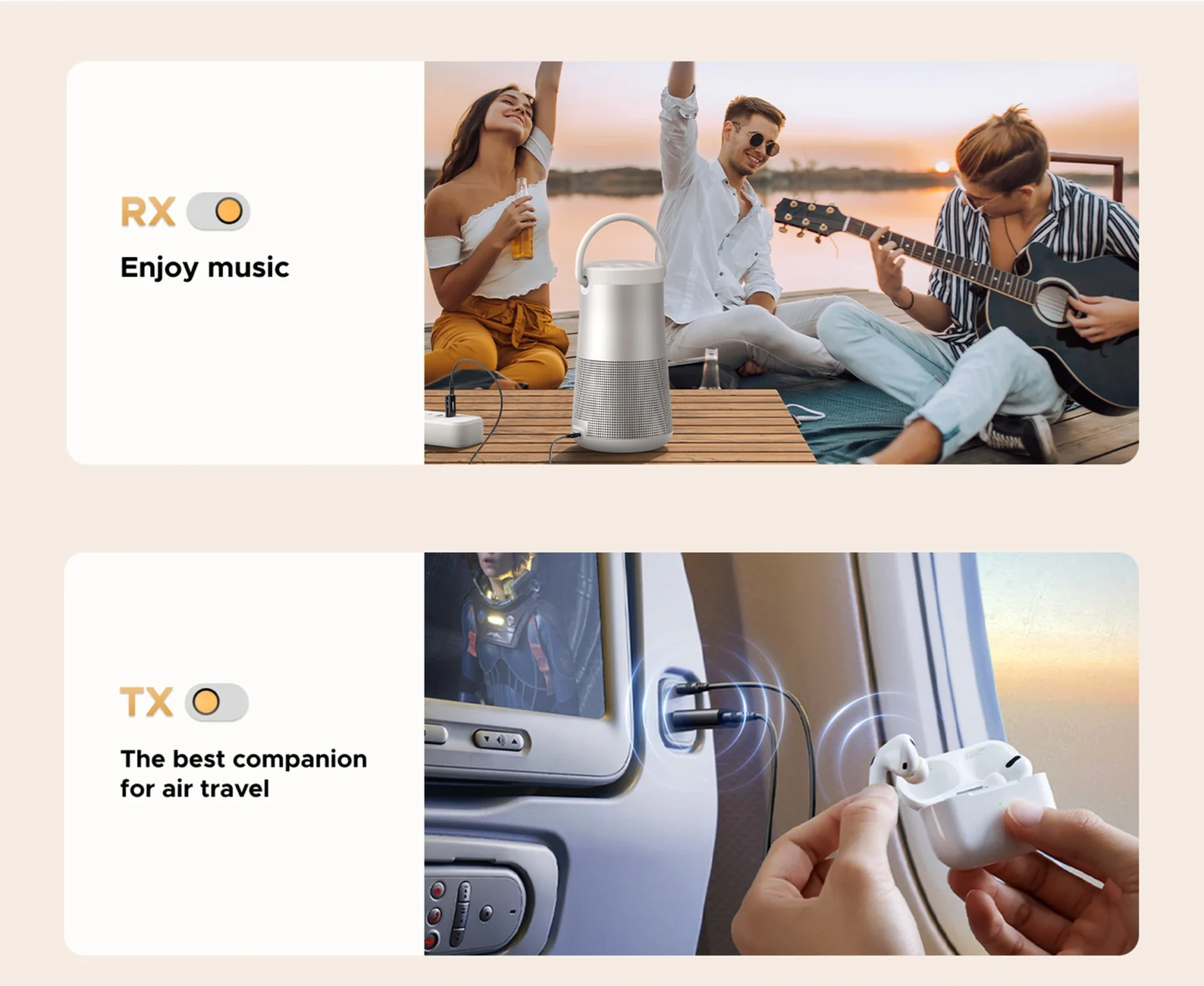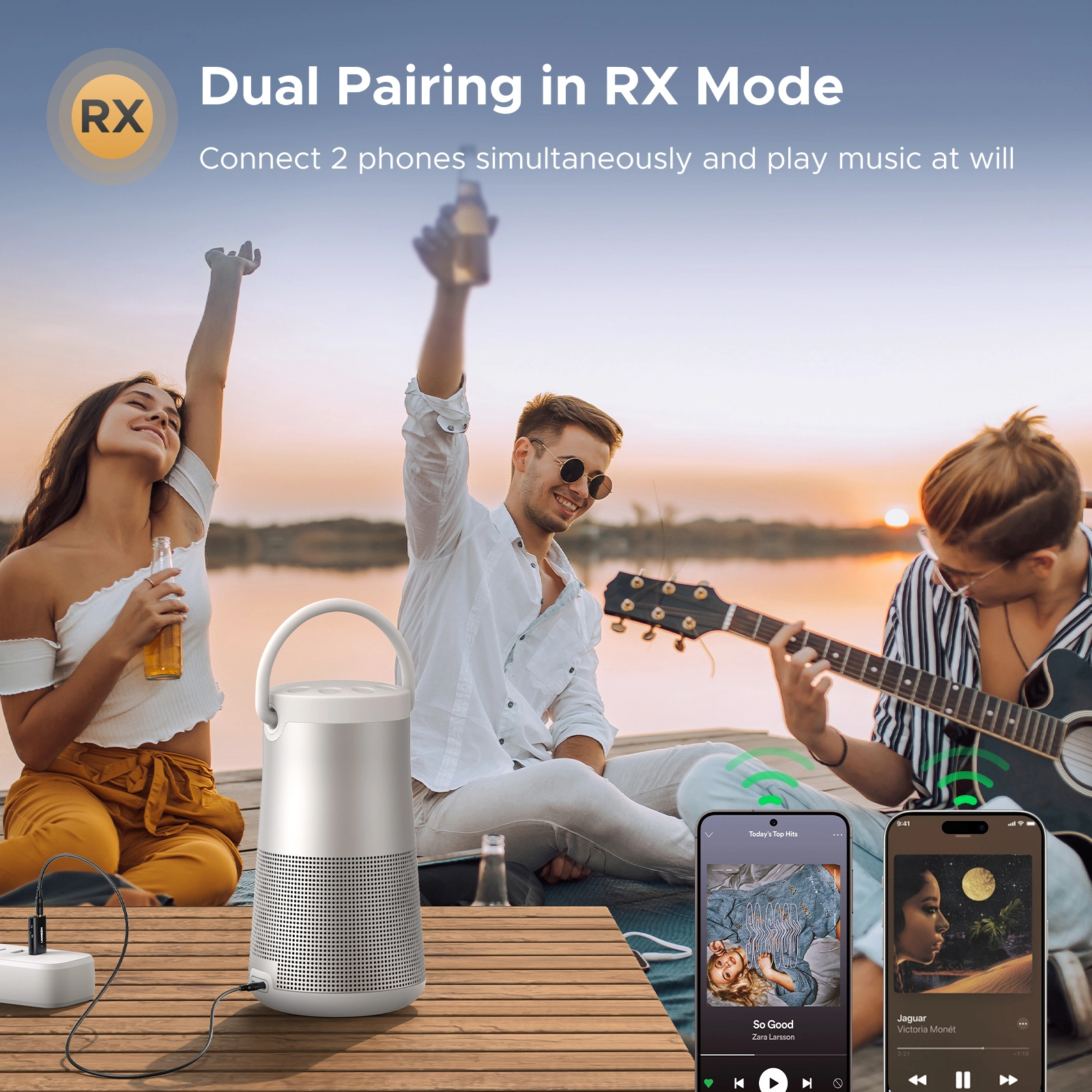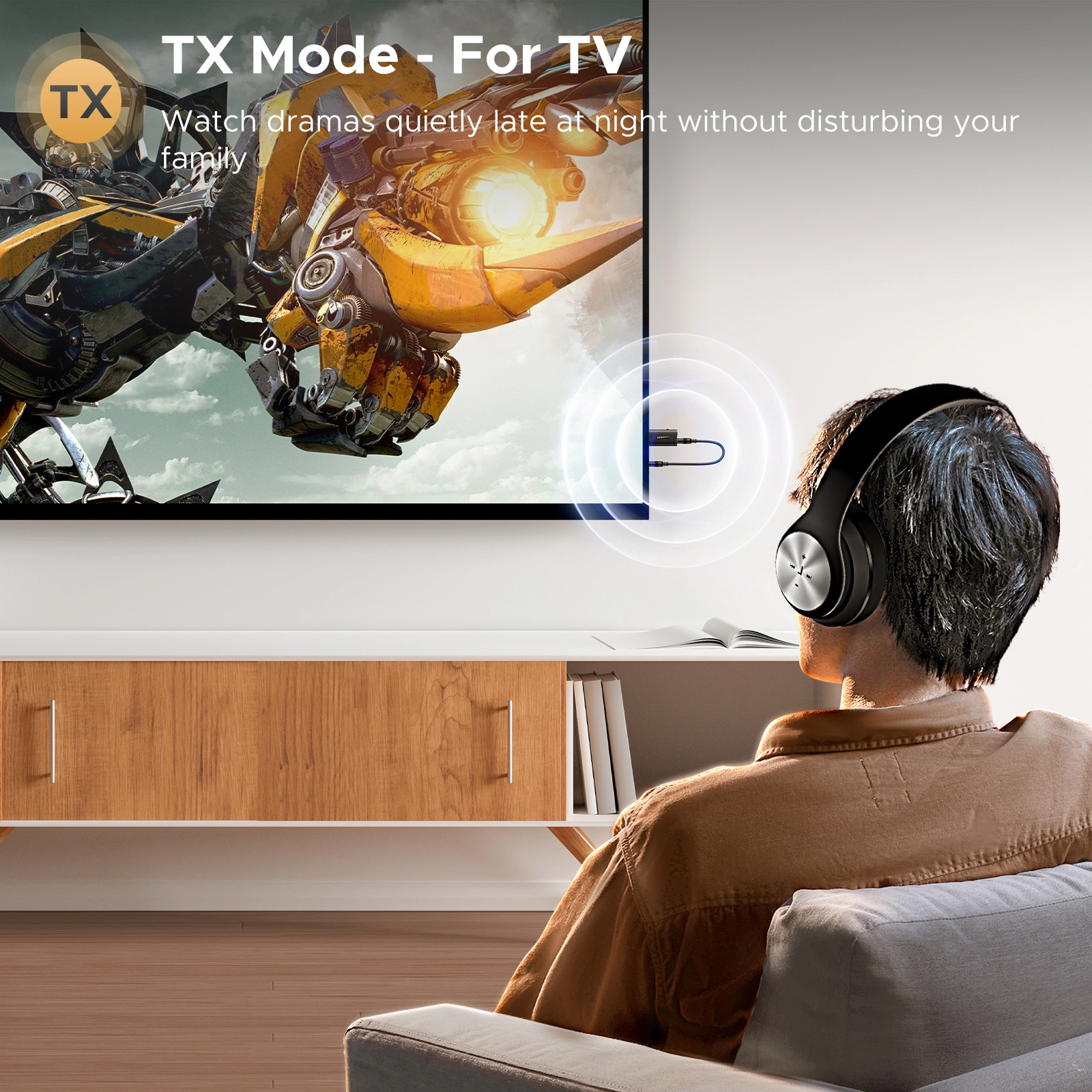 Switch between transmitter and receiver modes with ease. Connect TVs or PCs to Bluetooth headphones, or stream phone audio to wired speakers.